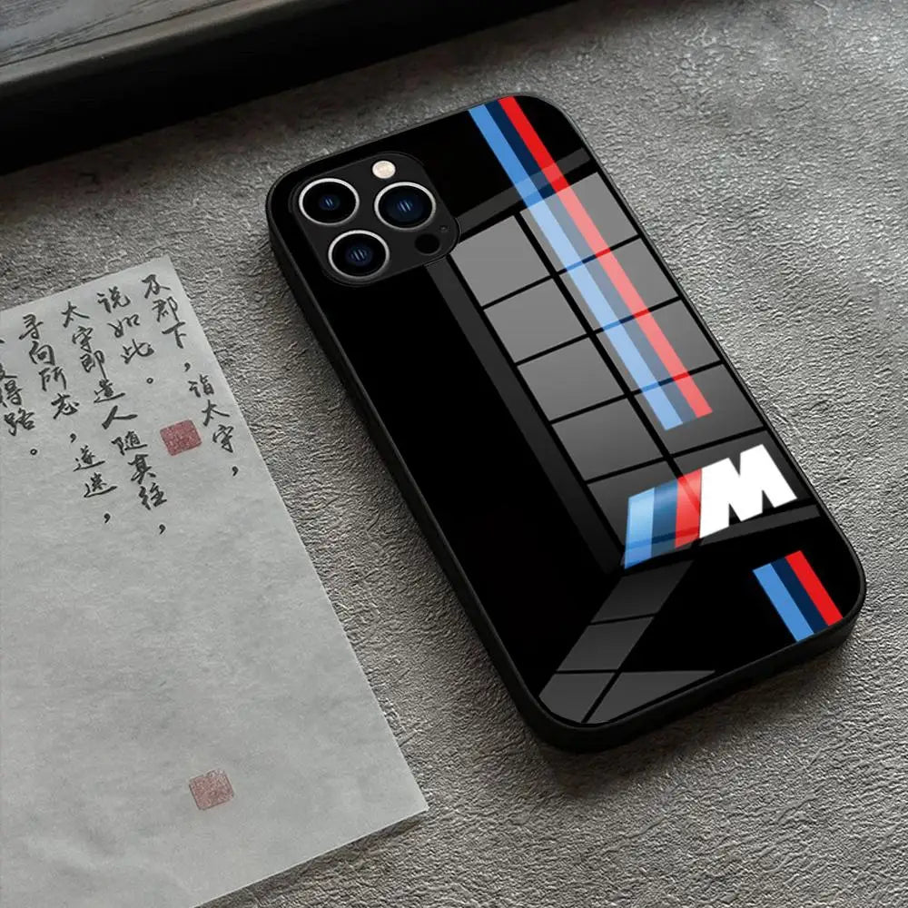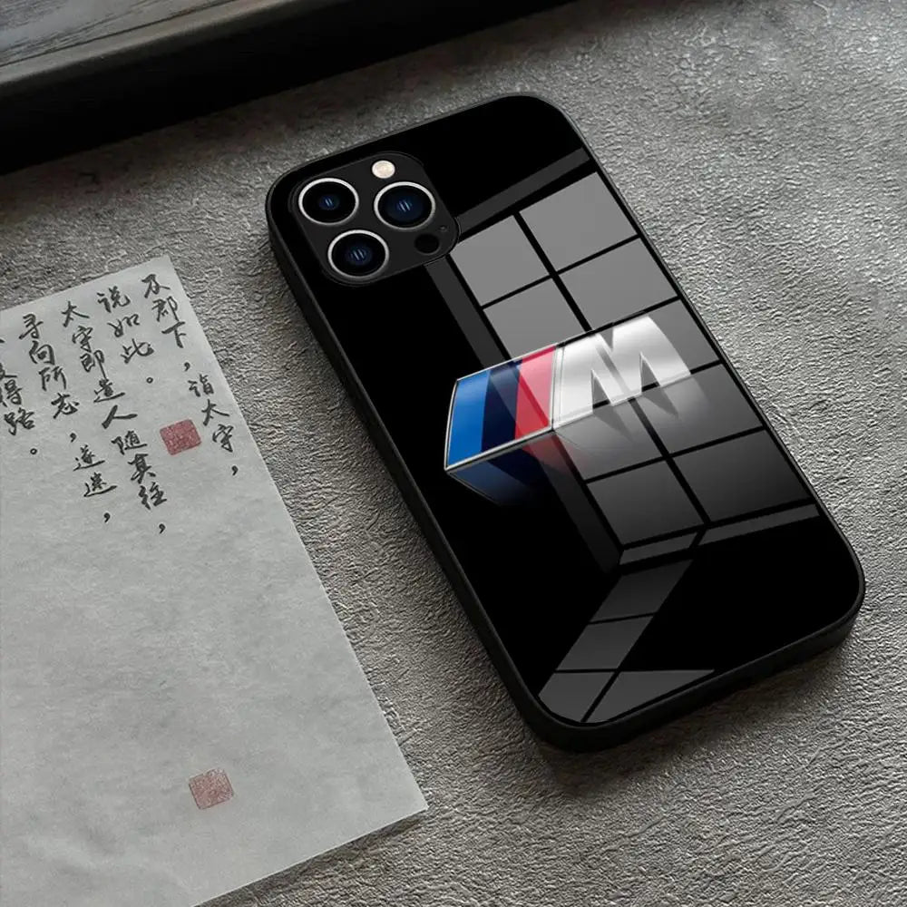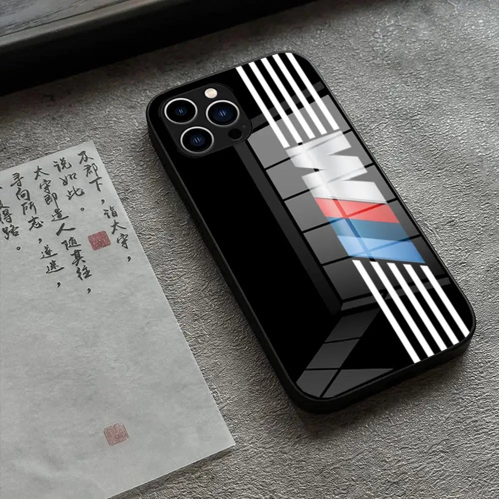 BMW Sports Series Tempered Glass iPhone Case – Premium Shockproof Cover for iPhone 12 to 16 Pro Max